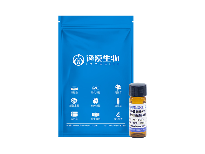 叠氮溴化乙锭(Ethidium monoazide bromide,EMA)是Hixon等发现于上世纪70年代的核酸荧光染料,分子式为C21H18BrN5,分子量为420.31,不溶于水、可溶于乙醇或DMF的橙色固体。叠氮溴化乙锭是一种具有亲和标签的核酸荧光染色试剂,光解后与核酸共价结合。染料用来印记药物的 DNA 结合位点,修饰质粒DNA 以及确定造血细胞在细胞周期进程 的表型、功能和位置等。在活细胞存在的情况下,叠氮溴化乙锭可以选择性地共价标记死细胞。由于叠氮溴化乙锭对活 细胞具有不可渗透性,在死细胞和活细胞共同存在下,它有选择地标签坏死细胞 DNA,光解后共价标记死细胞DNA,可以通过分析显微镜、荧光板或流式细胞术进行观察分析。该方法的主要优点是可以避免广泛的活性菌操纵。叠氮溴化乙锭已经被用于通过 5′核酸酶 PCR 区分死细菌和活细菌。