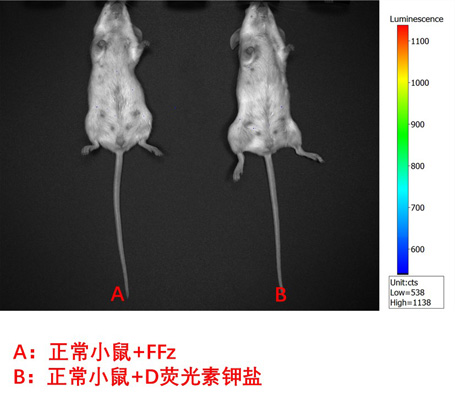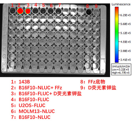 在进行荧光素检测实验时,我们选取了无示踪报告基因标记的细胞系143B、携带纳米荧光素酶(NLUC)标记的细胞系MOLM13和B16F10,以及携带萤火虫荧光素酶(FLUC)标记的细胞系MOLM13和U2OS,并将它们分别加入96孔板中进行分组实验。实验中,我们向标记细胞中添加了FFz底物和D荧光素钾盐底物,并测定了荧光强度。结果显示,只有在标记细胞与相应底物共同存在的情况下,才能观察到荧光成像。此外,对于正常小鼠的实验组,无论是注射FFz底物还是D荧光素钾盐底物,均未观察到荧光成像。
